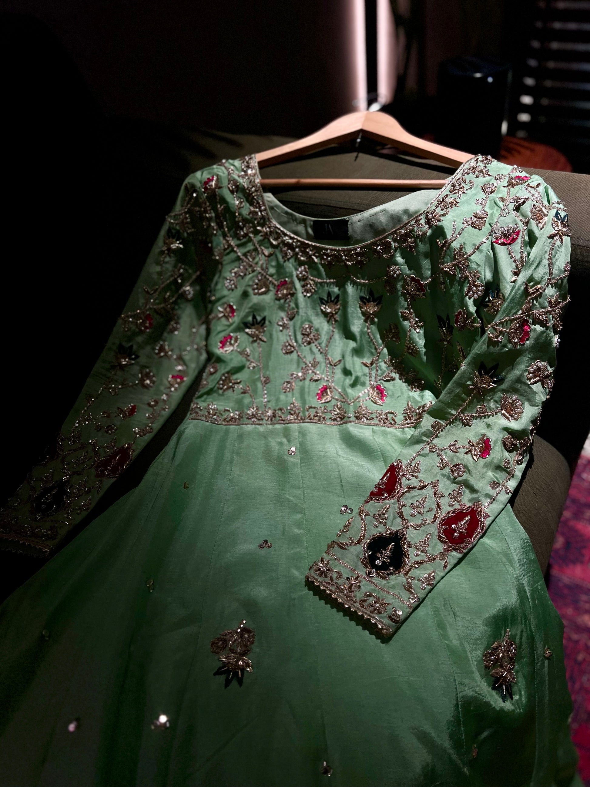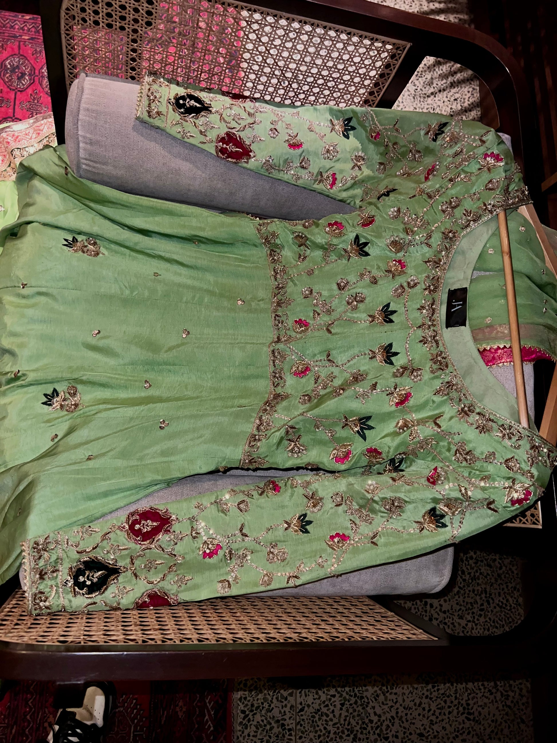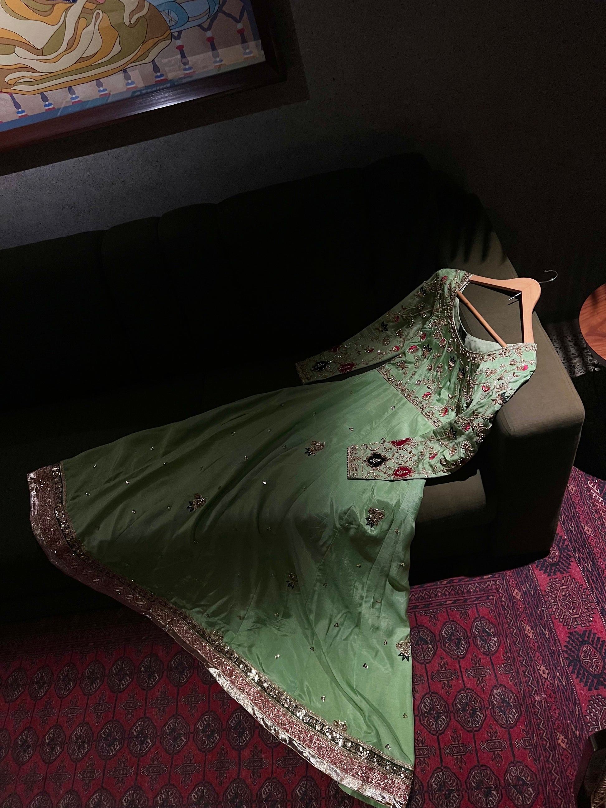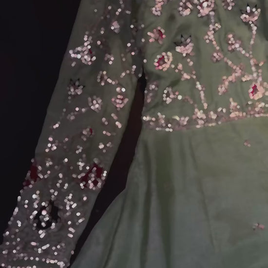 Crafted in pure shesha silk, this mint green beauty is adorned with intricate embellished work with pure dupatta.