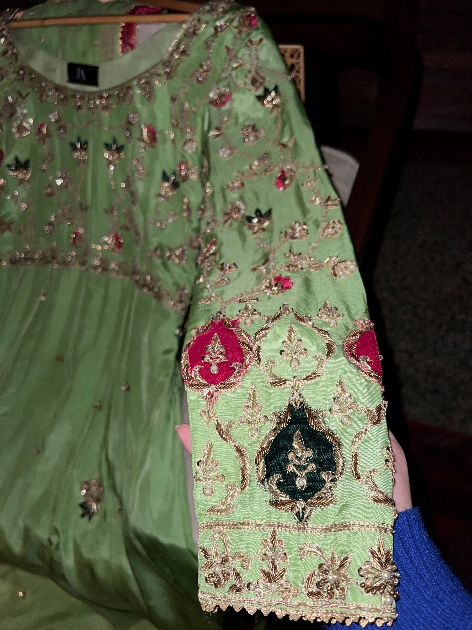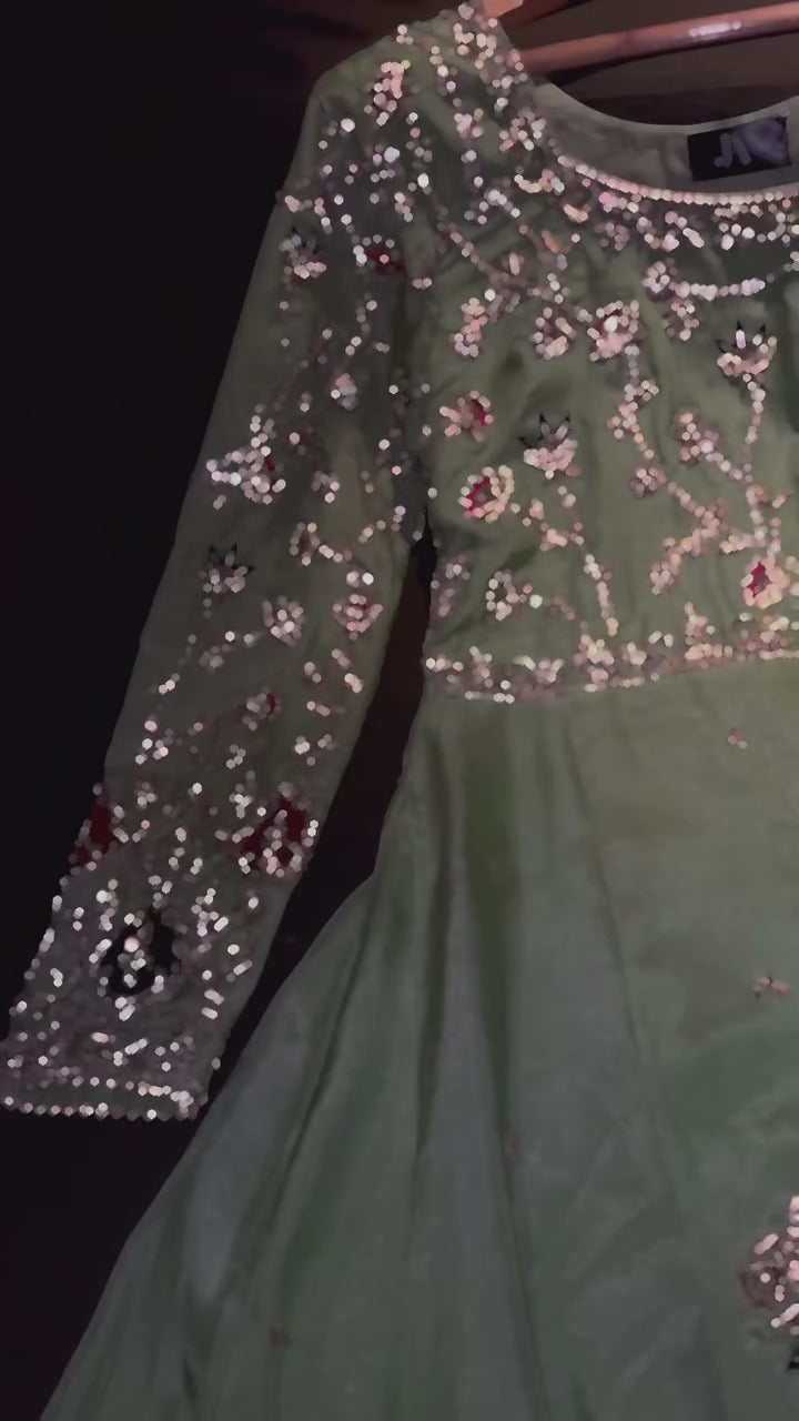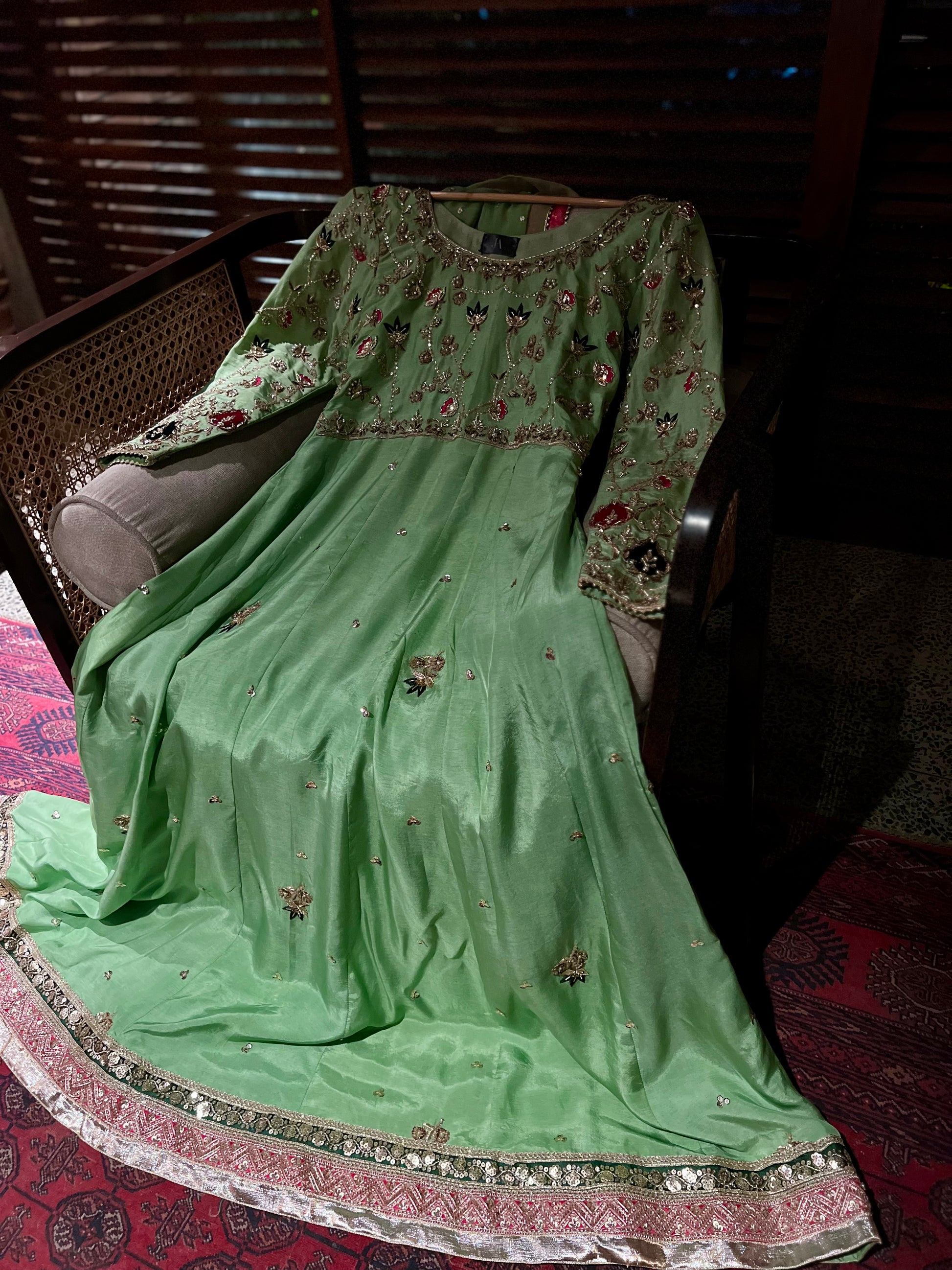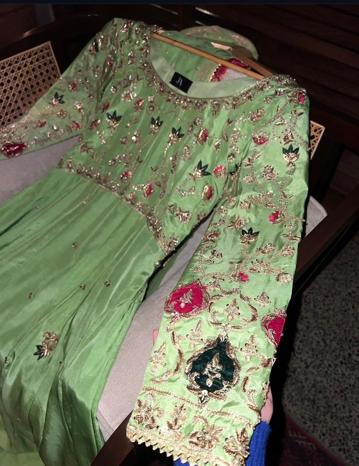 Crafted in pure shesha silk, this mint green beauty is adorned with intricate embellished work with pure dupatta.