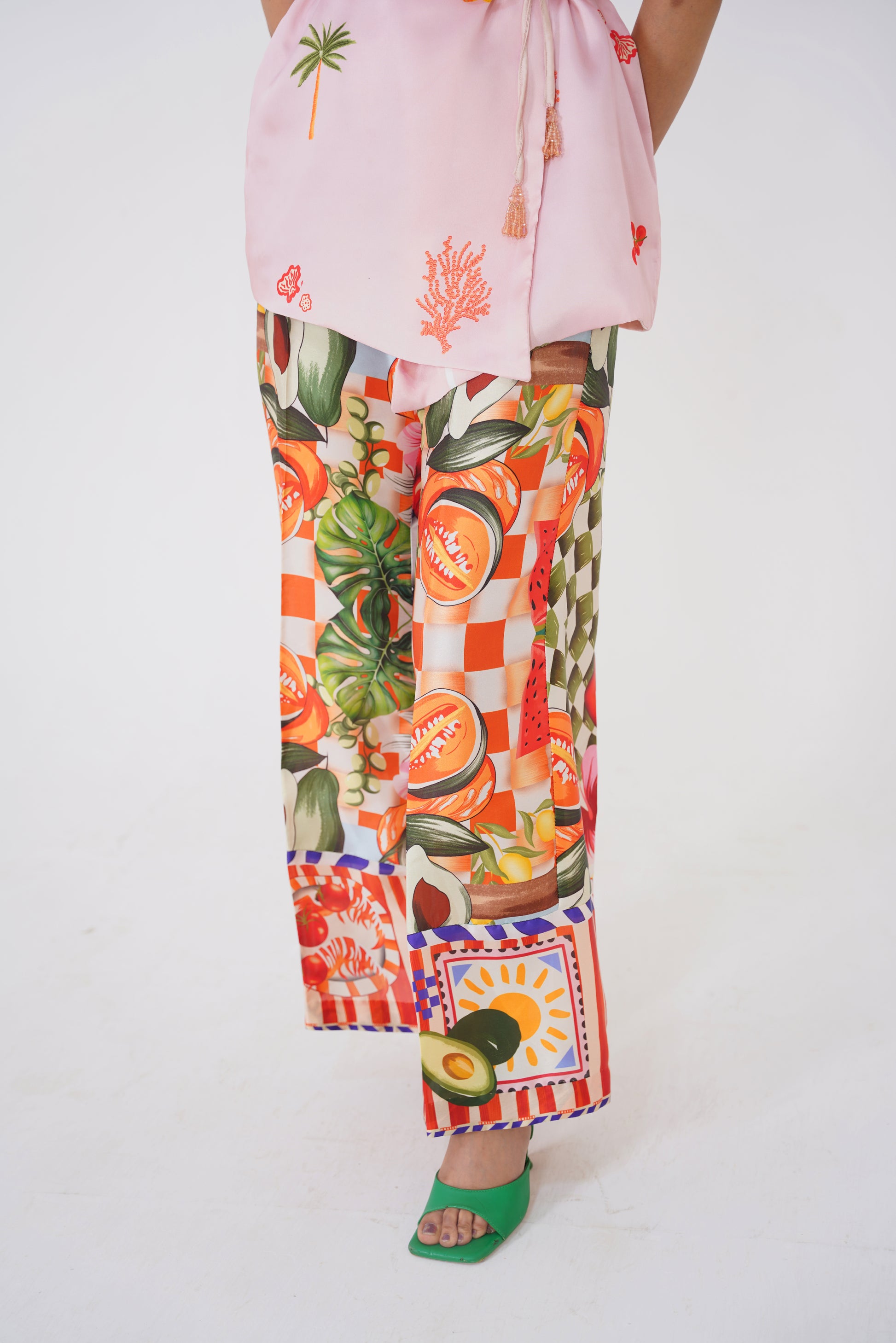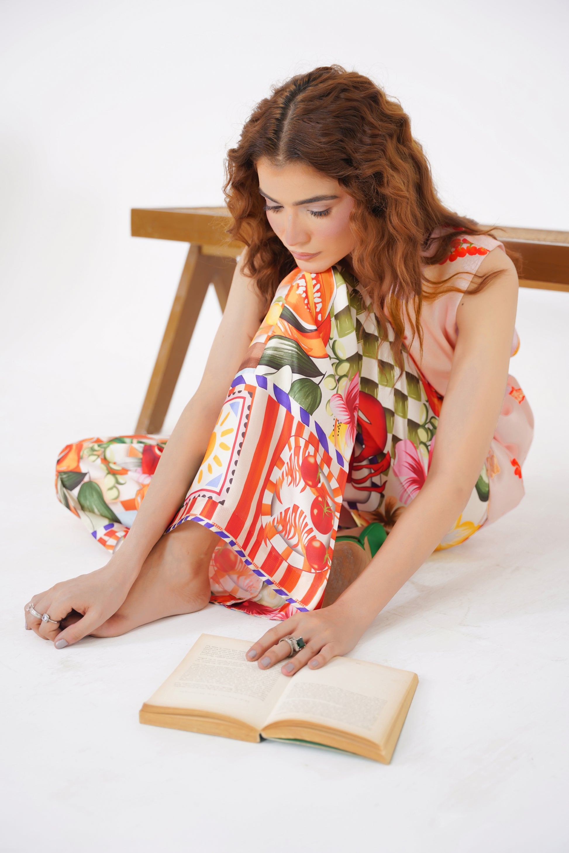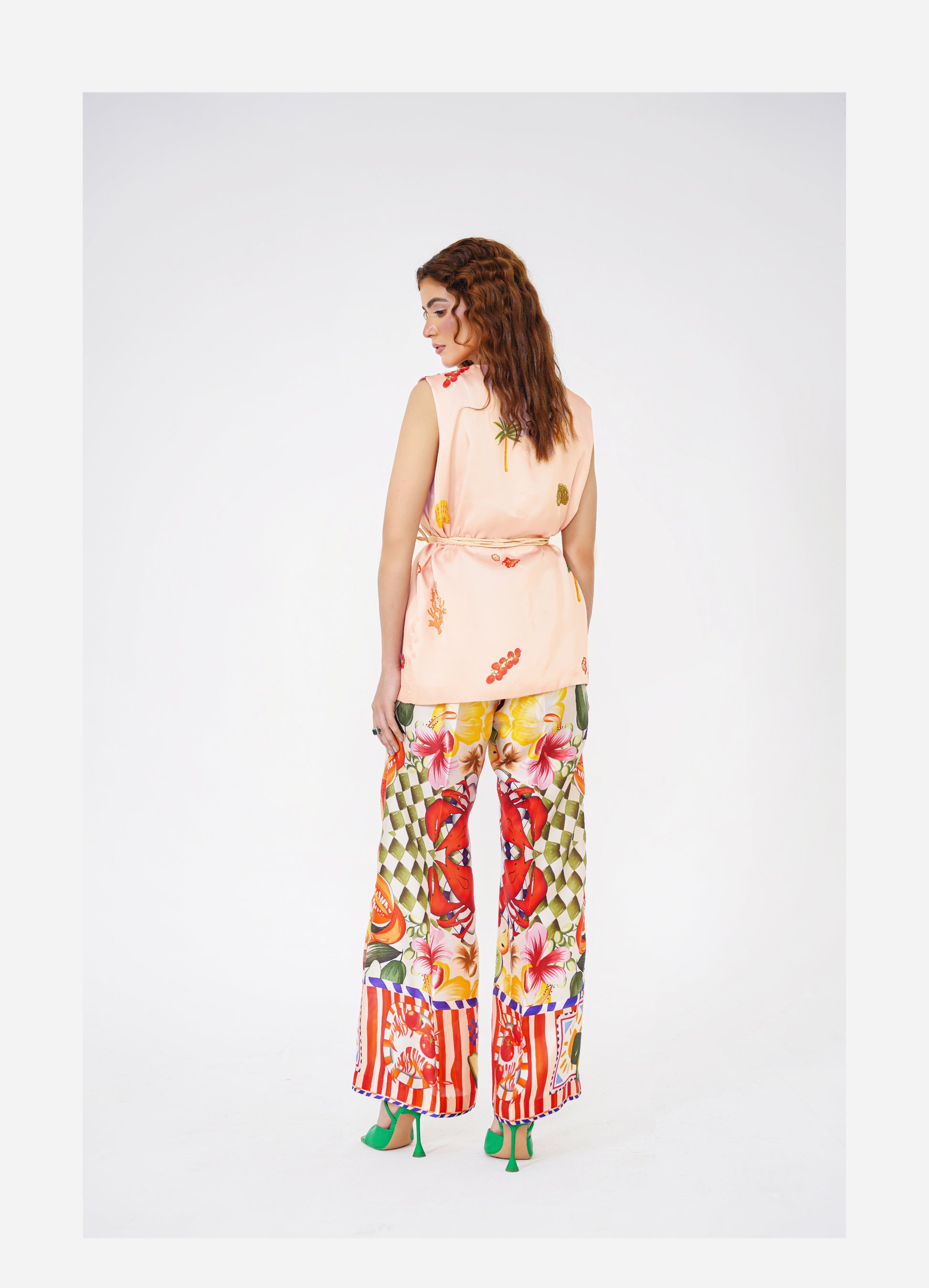 Elevate your everyday style with this effortlessly modern co-Ord set, crafted from pure silk. The sleeveless top features a flattering V-neckline with delicate tie-up details, lending an element of playful sophistication. Paired with wide-leg trousers accented by beautiful print, this ensemble exudes minimal elegance with a contemporary twist perfect for day to evening transitions.