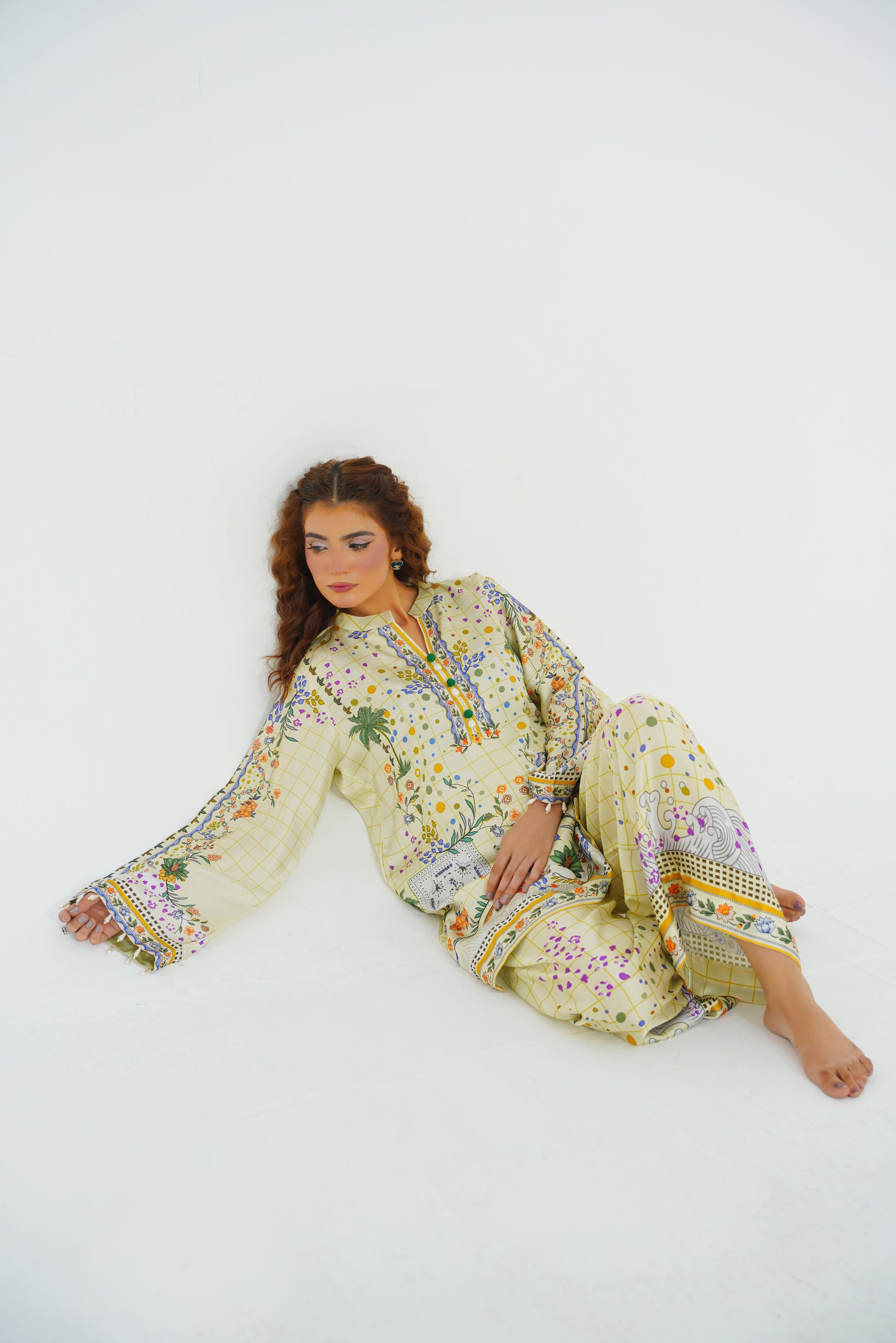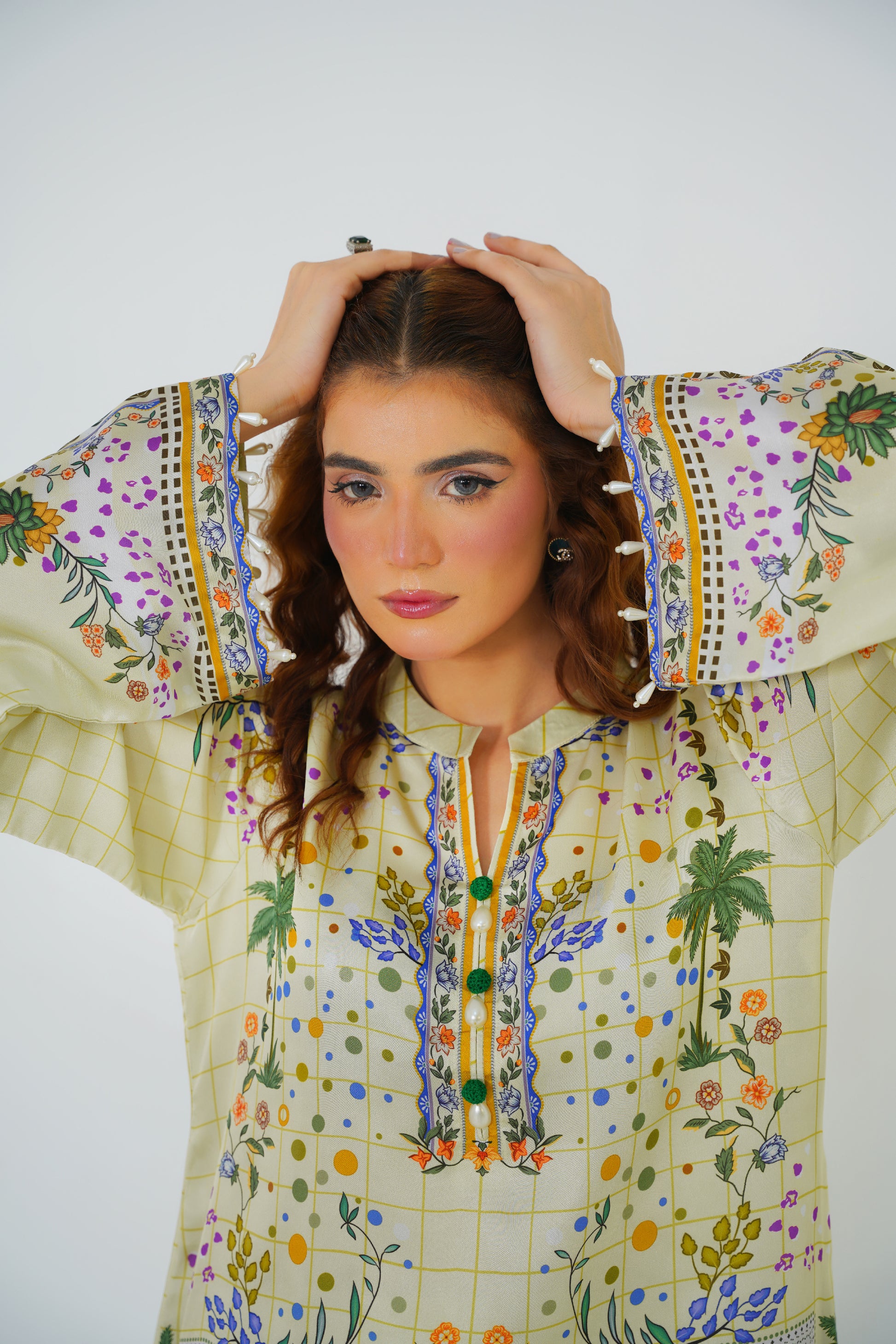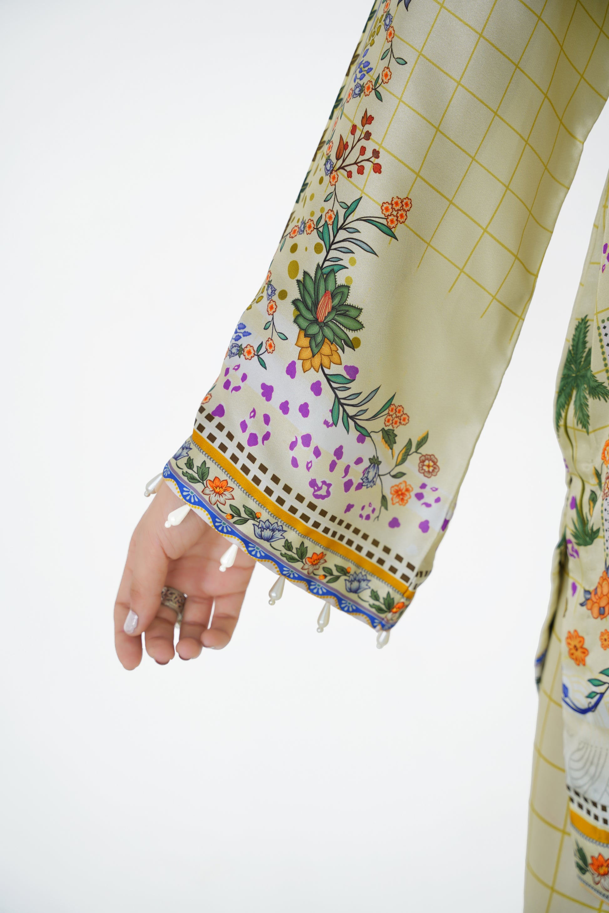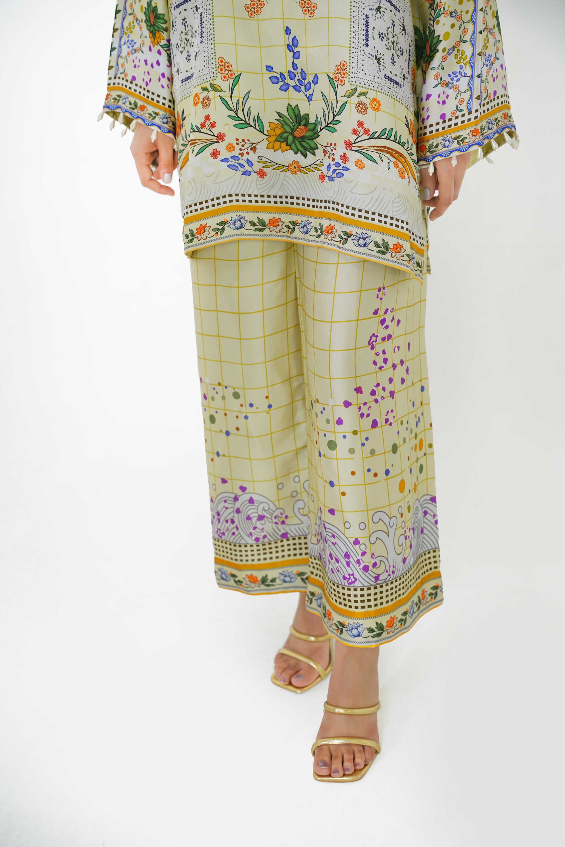 Experience effortless elegance in our Pastel Paradise Co-ord. Featuring creamy pastel tones adorned with delicate floral print, this ensemble boasts intricate details at the neckline and charming pearl hangings accenting the sleeves. Perfect for a chic day out or adding a touch of sophistication to your festive wardrobe.